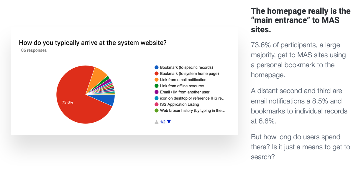 I began research by conducting a survey of 100+ users across all MAS applications. After receiving the results, I compared this qualitative feedback with user analytics to see when or if the sources told different stories. This work provided a treasure trove of insights that would form the basis of our intervention, including…- 74% of users reported arriving at their application via the homepage